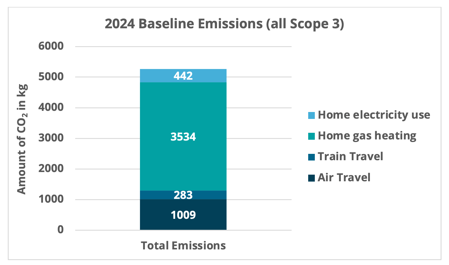 We have taken calendar 2024 as our baseline year and have calculated our total emissions (which in practice are quantified Scope 3 emissions) for that year as 5,269.87kg CO2 (see chart).